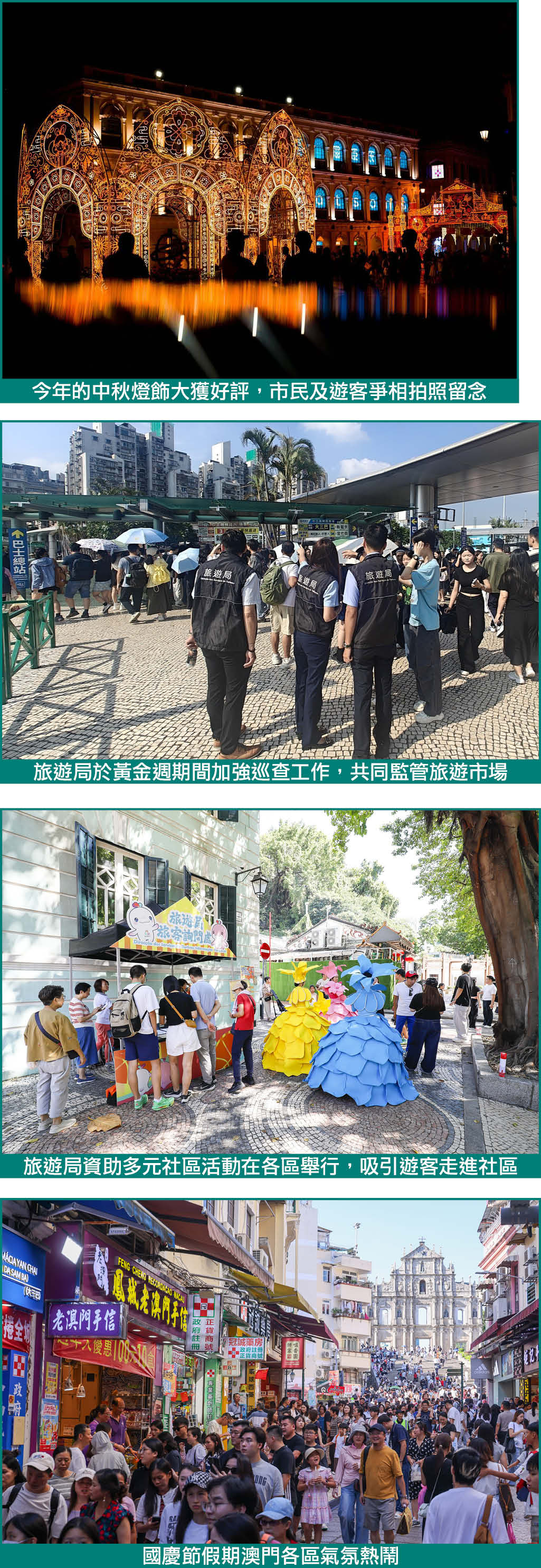 國內多家線上旅遊平台數據顯示,黃金周客群消費模式轉變,更加著重深度體驗及觀光“打卡”,購物也更理性,講求性價比。旅客消費模式的轉變,正在推動著澳門業界積極識變、應變與求變。黃金周湧現的新氣象,印證旅遊業成功進入了轉型關鍵期。展望未來,澳門有必要從“強化特色”和“提升體驗”兩方面加大力度。一方面,拓展文化旅遊、非遺旅遊、體育旅遊、演藝旅遊等,滿足不同消費群。另一方面,舉辦更多大型活動,發展盛事經濟。新加坡近年定位為活動盛地,舉辦大型演唱會及體育賽事,單是本週末舉辦的F1賽事,就能吸引約30萬高端旅客,值得澳門借鑒。