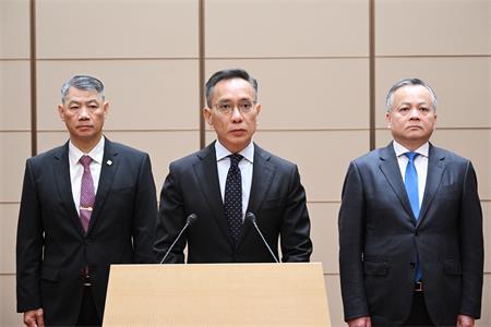 【本報訊】新任行政法務司司長黃少澤、保安司司長陳子勁、檢察院檢察長唐曉峰今(16)日早上出席澳門特區第八屆立法會全體議員宣誓就職儀式後,在中國與葡語國家商貿合作服務平台綜合體接受傳媒訪問。他們衷心感謝中央政府和行政長官的信任,並表示會不負重托,繼續為澳門特區發展建設貢獻力量。