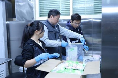 首批供澳門賽區運動員食品,包括凍肉類食品、冷凍包點及調味料,總重共45.3噸,按照嚴謹的食品安全保障工作方案,已順利從廣州總倉運往澳門。為確保專供澳區食材的安全,貨車通關後直接運往檢疫地點進行卸貨檢疫,由市政署人員核對貨車封條及總倉提供之貨物清單資料,並進行檢驗檢疫,隨即進入專倉上鎖保存,實現從產地到使用地閉環管理,保障食材安全可靠。