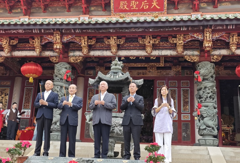 何厚鏵、王金平、林金贊在陳明金、顏奕萍陪同下拜天,及後移步大殿向天上聖母上香