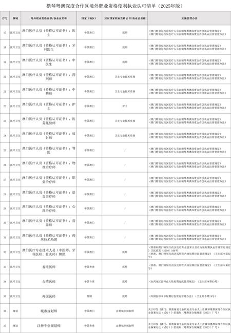 《清單》涵蓋法律、金融、會計、稅務、藥學、醫療衛生、建築、規劃、旅遊、社工10個領域,包括律師、證券從業人員、會計師、稅務師、土木工程師等87項職業資格,其中有49項為澳門職業資格,進一步拓寬了澳門專業人士在合作區的執業空間。