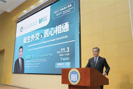 【本報訊】全國政協副主席、共享基金會主席、澳科大榮譽博士梁振英一行於2025年11月3日上午蒞臨澳門科技大學N101大禮堂為大學師生帶來一場題為“衛生外交及民心相通”(“Health Diplomacy and People to People Connectivity”)的專題講座,近200名師生出席現場聆聽。