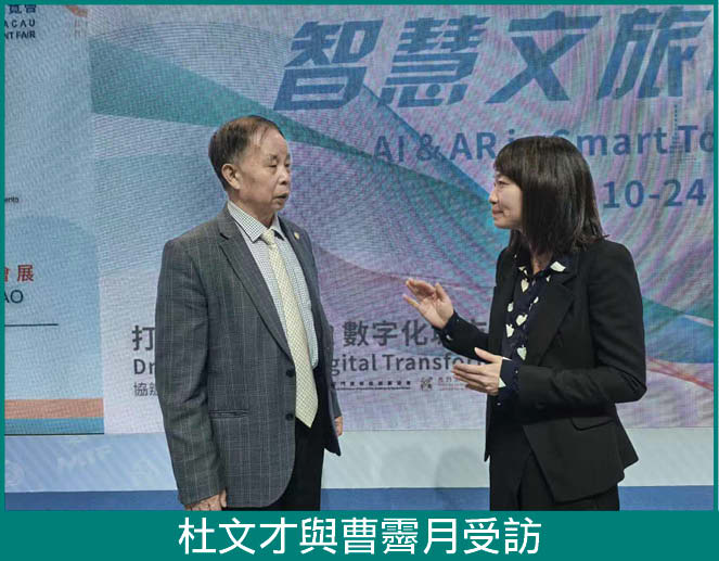【本報訊】10月24日,澳門國際投資展覽會(MIF)“智慧文旅:打造澳門AI+AR數字化城市”主題論壇順利舉行。澳門聖若瑟大學數據工程與科學學院院長杜文才教授與澳門旅業匯B2B平台總監曹霽月於會後接受專訪,圍繞數字技術如何賦能澳門旅遊產業及產學研合作新模式展開深入交流。