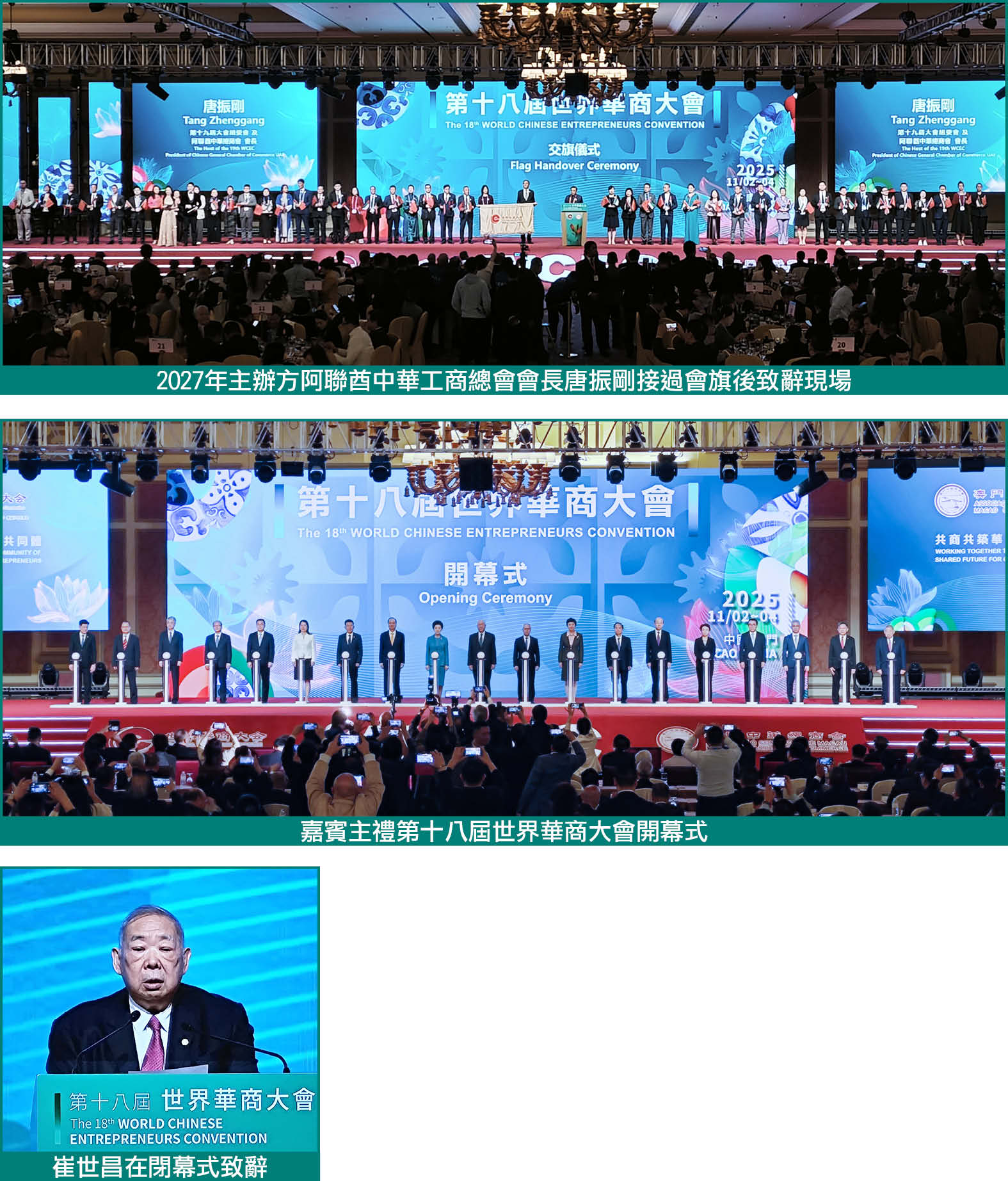 第十八屆世界華商大會,於112日至4日在澳門隆重舉行。本屆大會以“共商共築華商命運共同體”為主題,旨在促進全球華商間的交流與合作,共同探索發展新機遇。全國政協副主席何厚鏵、咸輝,澳門行政長官岑浩輝,澳門中聯辦主任鄭新聰,國務院僑務辦公室主任陳旭,中國僑聯主席王靈桂,全國政協常委、港澳台僑委員會主任劉賜貴,全國人大常委會委員、全國人大華僑委副主任委員顏珂,外交公署特派員劉顯法,全國工商聯專職副主席羅來君,原中國科學院院長、“一帶一路”國際科學組織聯盟創始主席白春禮,澳門立法會主席張永春,經濟財政司司長戴建業,以及程紅、陳建安、蔡冠深、高泉慶、林楚欽、崔世昌擔任主禮嘉賓。中央政治局常委,第十四届全国政协主席王沪宁賀信中表示,全球華商長期以來在促進中國經濟社會發展,中外經貿與人文交流等方面作出了重要貢獻。