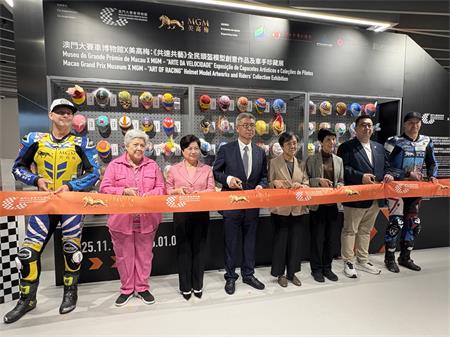 【本報訊】為進一步推動社會共融理念,美高梅與大賽車博物館攜手推出並獲得教青局、工會聯合總會、街坊會聯合總會、婦女聯合總會及扶康會大力支持的《共速共融》全民頭盔模型創意作品及車手珍藏展今(12)日上午11時在大賽車博物館揭幕。展覽呈獻全民參與創作的頭盔模型與車手珍藏,展期由即日起至明年1月5日。旅遊局局長文綺華、工會聯合總會會長何雪卿、婦女聯合總會會長劉金玲、街坊會聯合總會副會長姚家鵬、扶康會會員大會主席飛迪華和美高梅中國控股有限公司總裁及首席運營官王志琪等出席開幕儀式。