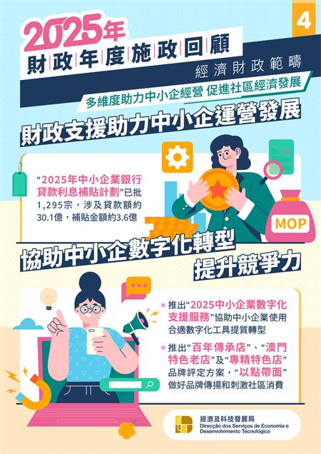 為協助中小企業資金周轉,特區政府推出“2025年中小企業銀行貸款利息補貼計劃”,為符合資格的商業企業主提供利息補貼,截至11月5日,已獲批准的申請有1,295宗,涉及銀行貸款金額約30.1億澳門元,補貼金額約3.6億澳門元。此外,經科局持續檢視及完善“中小企業援助計劃”及“青年創業援助計劃”內容,支持企業的業務發展。