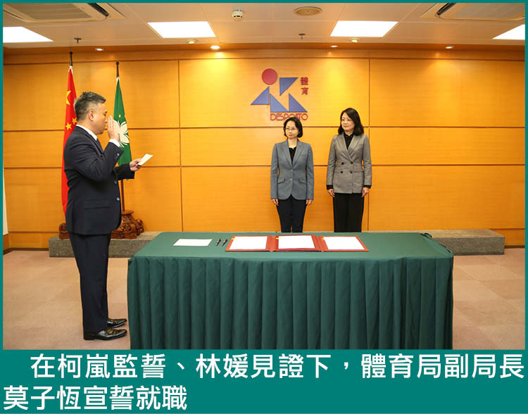 【本報訊】在社會文化司司長柯嵐監誓、社會文化司司長辦公室主任林媛見證下,體育局副局長莫子恆於6日在體育局總部宣誓就職。