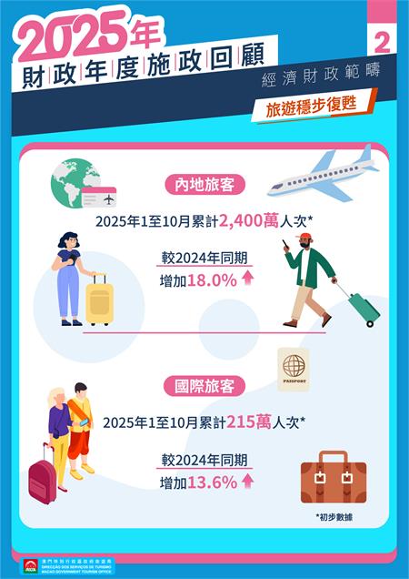 初步數據顯示,2025年1至10月,澳門入境旅客累計3,300萬人次,同比增長14.1%,恢復至2019年同期的99.3%。國際旅客持續增長,達215萬人次,同比上升13.6%。國慶“黃金周”期間,日均入境旅客14.3萬人次,10月4日單日更高達19.1萬人次,均創下歷年國慶假期新高。酒店業表現理想,1至9月平均入住率為89.3%,同比上升3.9個百分點。