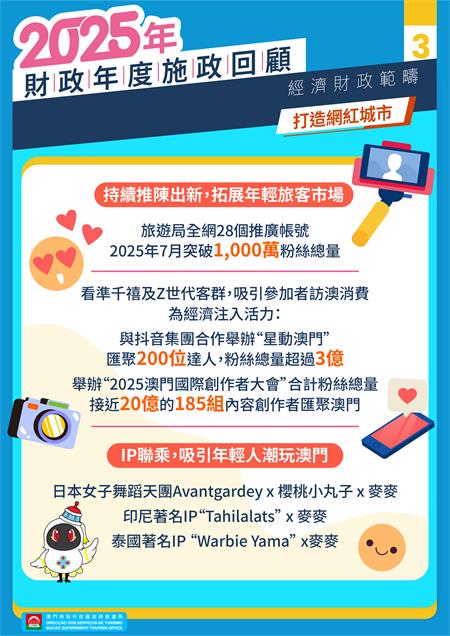 旅遊局官方社交媒體粉絲總量已突破1,000萬,透過“星動澳門”及國際網紅活動“CreatorWeek Macao 2025”等,打造澳門“網紅城市”形象,吸引年輕客群訪澳消費。