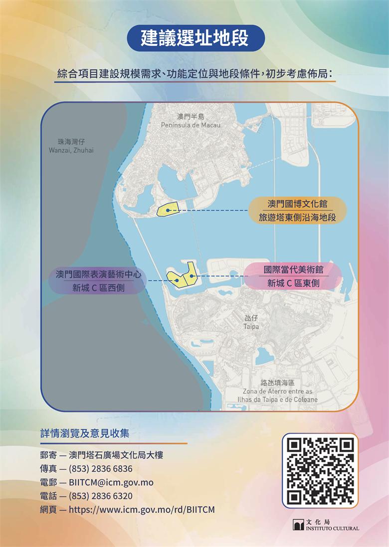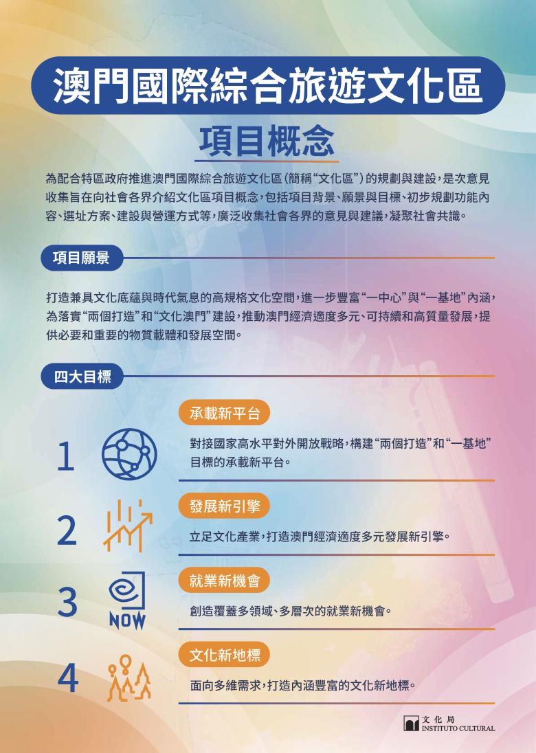 【本報訊】為推動澳門文化旅遊產業的創新與可持續發展,特區政府正積極規劃建設澳門國際綜合旅遊文化區(下稱“文化區”),致力打造兼具文化底蘊與時代特色的高規格文化空間,形成集文化展演、藝術交流、旅遊休閒與商業配套於一體的文化新地標。為廣泛聽取社會各界對項目目標定位、建築選址、設施配套及營運管理等方面的意見,文化局由即日(11月13日)起至12月26日就項目開展意見收集,期間將面向公眾以及專業團體舉辦多場意見收集會,歡迎市民踴躍參與,共同為文化區的規劃建言獻策。
