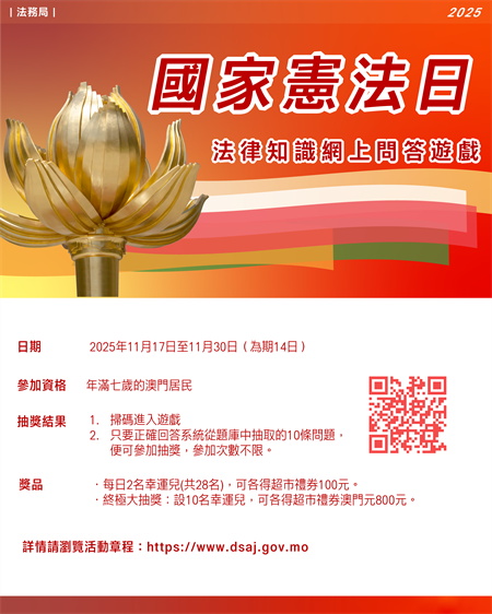 【本報訊】今年是第十二個“國家憲法日”,法務局於20251117日至1130日(為期14日)期間舉辦“國家憲法日”法律知識網上問答遊戲,透過寓學習於娛樂的遊戲方式,加強社會各界對《憲法》和《澳門基本法》的認識,歡迎本澳居民參加。