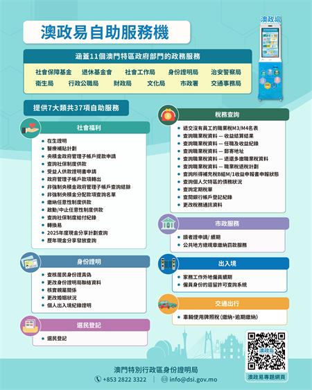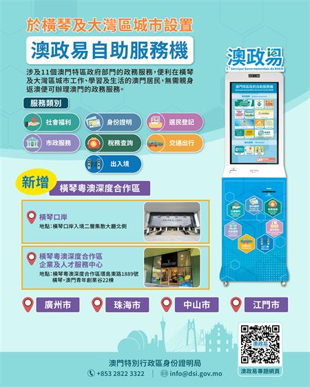 “澳政易”自助服務機提供澳門特區政府有關社會福利、身份證明、稅務查詢、市政服務、選民登記、交通出行及出入境共7個類別,涉及11個部門共37項澳門居民常用的政務服務,便利在區內工作及生活的澳門居民,無需回澳便可辦理所需服務,助力營造澳琴趨同的宜居環境。“澳政易”自助服務機設於橫琴口岸入境二層集散大廳北側及橫琴粵澳深度合作區企業及人才服務中心(地址:粵澳深度合作區環島東路1889號橫琴.澳門青年創業谷22棟)。此外,於今年6月,上述自助服務機已設於廣州市、珠海市、中山市及江門市共四個大灣區城市。有關“澳政易”自助服務機詳情,請瀏覽“澳政易”專題網頁:https://www.dsi.gov.mo/mo-eservice/。