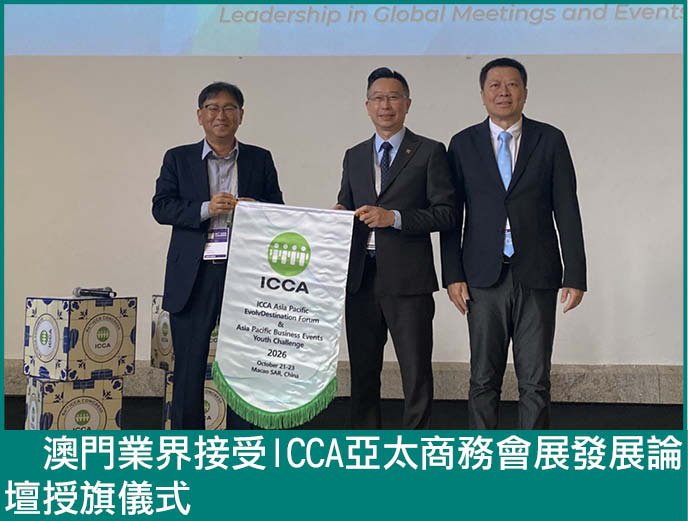 此行的重要成果之一,是本澳業界成功競投“2026 ICCA亞太商務會展發展論壇暨亞太商務會展活動挑戰賽”(ICCA AsiaPacific Business Events Development Forum & Asia Pacific Business EventsYouth Challenge) 首次落戶澳門。澳門招商局現場見證業界就落戶事宜簽署合作備忘錄,並參與授旗儀式。