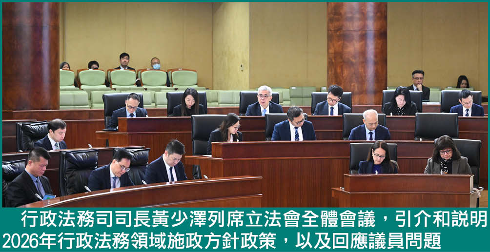 【本報訊】行政法務司司長黃少澤於21日在立法會引介2026年行政法務範疇施政方針,他指出,2026年該司在2025年施政工作已取得的良好成效的基礎上,按照已訂立的施政方向和目標,結合各種具體情況和各類綜合資料,進一步深化公共行政改革,圍繞簡政放權、放管結合、優化服務的“放管服”改革方向,提升施政效能,加強立法規劃,全面推進各項法制建設,以民為本,完善市政服務,凝聚更大合力,在公共行政、法務和市政服務三個重點領域,更加積極開展各項施政工作。