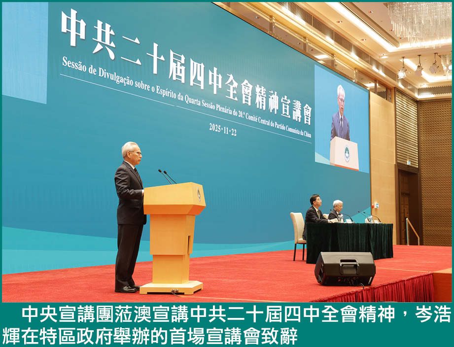 【本報訊】應澳門特區政府請求,經中央批准,中央港澳工作辦公室、國務院港澳事務辦公室邀請中央宣講團成員,中國科學院院長、黨組書記侯建國和中央宣講團成員,中央財經委員會辦公室副主任、中央農村工作領導小組辦公室副主任祝衛東蒞臨本澳,於11月22日在在中國與葡語國家商貿合作服務平台綜合體,舉行2場宣講中共二十屆四中全會精神會議。特區政府各主要官員、行政會委員、立法會議員、司法界官員、以及特區政府局廳級官員等約600人出席了首場宣講會;社會各界代表等約600人出席第二場宣講會。