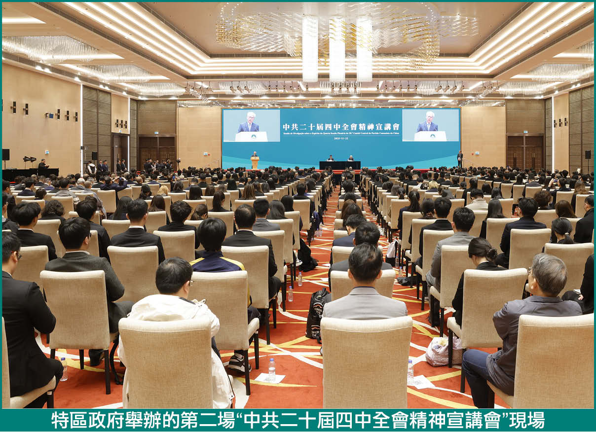 行政長官岑浩輝,中央港澳工作辦公室副主任、國務院港澳事務辦公室副主任、中央人民政府駐澳門特別行政區聯絡辦公室主任鄭新聰分別在宣講會上致辭。侯建國、祝衛東分別作宣講,深入闡釋了中共二十屆四中全會精神,以及《中共中央關於制定國民經濟和社會發展第十五個五年規劃的建議》的主要內容和重大意義,兩位宣講團成員亦回應了與會者提出的問題。