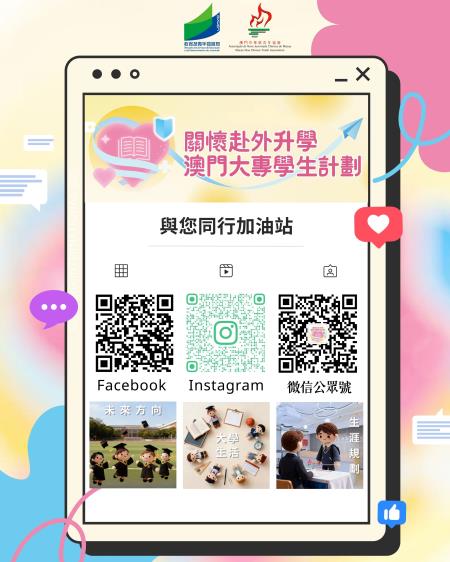 為進一步擴闊資訊傳遞與互動渠道,教青局推出“與您同行加油站”Facebook專頁、微信公眾號以及Instagram帳號(gotyourback_hub),定期發佈與校園生活、心理健康及生涯規劃等相關的實用資訊,為赴外升學澳門大專學生提供更全面的支援服務。教青局未來將繼續與社會各界共同做好關懷赴外升學澳生工作,構建良好的環境,助力青年學生實現理想,回饋社會。