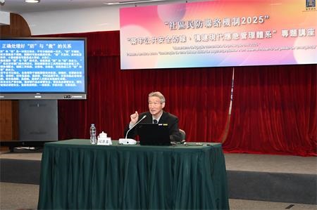 是次講座以“築牢公共安全防線,構建現代應急管理體系”為主題,由兩位公共安全領域的專家擔任主講嘉賓。閃淳昌教授以多個事故個案,作為依托,深入剖析“應急管理”的關鍵環節,為我們落實“總體國家安全觀”、完善應急管理機制、提升危機處置能力,提供了極具價值的實踐指引。范維澄院士圍繞“增強城市韌性”與“火災防控技術”,融合前沿科技與公共安全需求,為我們科技賦能安全防線、推動民防工作,邁向科學化及現代化,開拓了新的視野,高度契合國家“科技強安”戰略與澳門智慧城市的建設規劃。