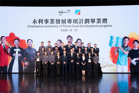 “永利事業發展專項計劃2025”採用“先入職、後培訓”模式,為學員提供為期1236個月的專項培訓旅程,涵蓋管事部、餐飲、廚藝、設施管理及前堂服務等領域。今年計劃進一步擴大規模,全年共招募了67位學員。在典禮上,勞工事務局及永利管理層代表共同主持啟動儀式,並向新一期學員致送紀念品,鼓勵他們開啟職涯新篇章。同場亦舉行“永利事業發展專項計劃2024”結業儀式,向上屆28位畢業學員頒發結業證書和紀念品,他們在完成課程後均獲得晉升機會,部分更獲擢升至主任或相若職級,充份體現永利致力推動本地人才向上流動的承諾。