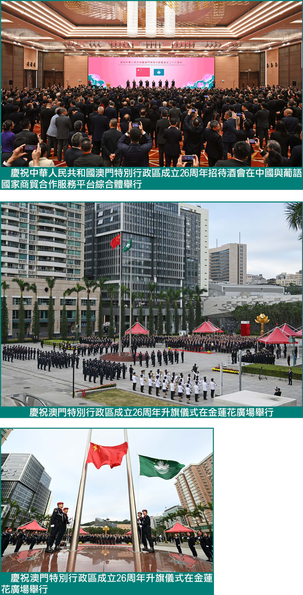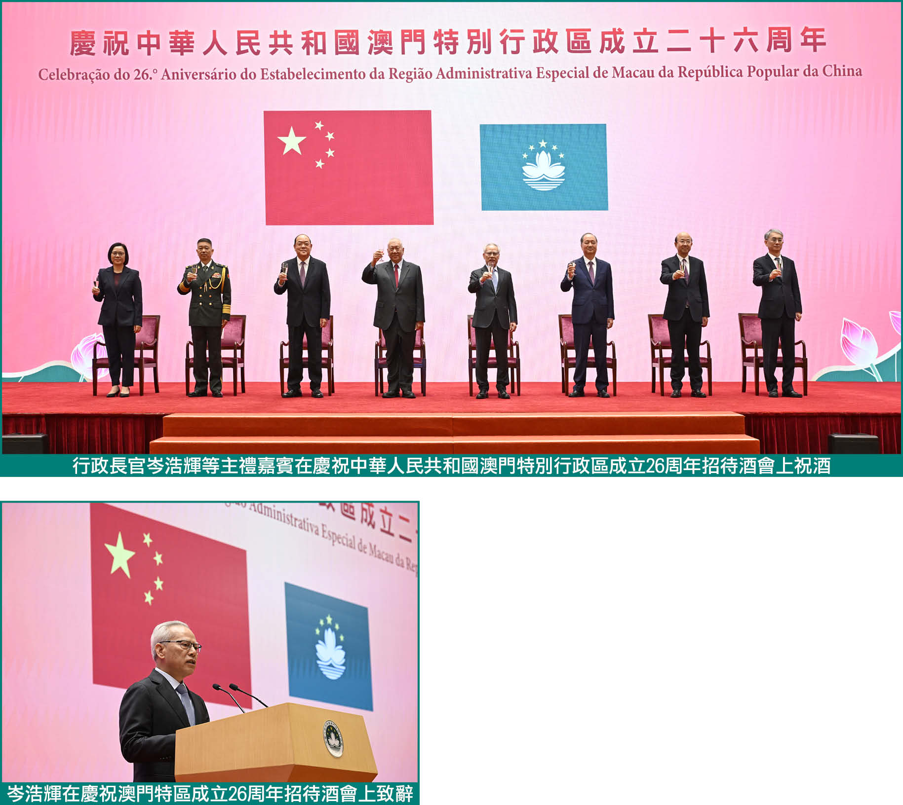 【本報訊】特區政府1220日舉行慶祝中華人民共和國澳門特別行政區成立26周年招待酒會。行政長官岑浩輝致辭時表示,二十屆四中全會擘畫了國家發展的新藍圖,中央“十五五”規劃建議對澳門未來發展作出了重要戰略部署,為特區發展提供了新的巨大機遇和政策動能。澳門將遵照習主席的重要指示,更加積極主動對接國家發展戰略,制定好、實施好澳門特區“三五”規劃,在服務強國建設、民族復興的新征程中,實現自身更好發展。