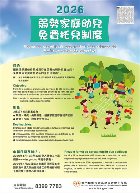 【本報訊】社會工作局協調30多間受資助托兒所推出“弱勢家庭幼兒免費托兒制度”,期望為缺乏照顧條件及經濟存在困難的弱勢家庭幼兒,提供申請免費使用受資助托兒所服務,於2026年1月12日起接受申請。