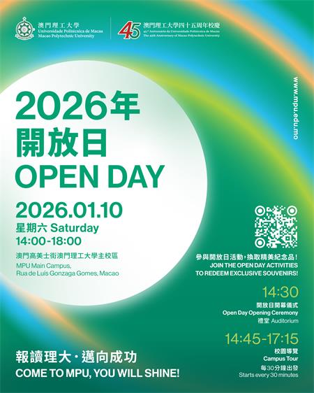 【本報訊】為喜迎澳門理工大學45周年校慶,澳門理工大學2026年開放日將於1月10日(星期六)於澳門高美士街澳理大主校區舉行。本年度開放日以“科創與‘理’成就卓越”為題,透過學位課程講解會、專題展覽、工作坊、體驗活動、升學諮詢、校園導覽,以及線上線下訪談節目“與‘理’Chit-Chat”等活動精彩紛呈,向社會各界展示澳理大的辦學特色、課程資訊、教研成果、社會服務及國際合作成果,歡迎中學生、家長,以及社會各界蒞臨澳理大參與卓越教研體驗。