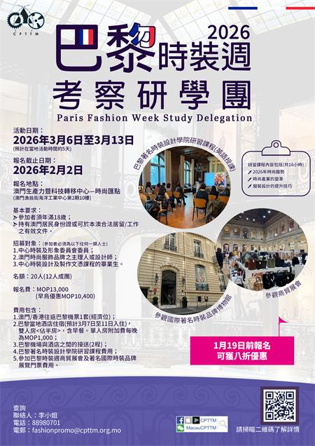 研學團名額有限,有意參加者請盡快報名。截止報名日期為2月2日,1月19日前報名可享八折優惠,詳情可瀏覽www.cpttm.org.mo。如有查詢,可電郵至fashionpromo@cpttm.org.mo,亦可於辦公時間致電8898 0716或親臨生產力中心時尚匯點(漁翁街海洋工業大廈第2期10樓)與李小姐或鍾小姐聯絡。