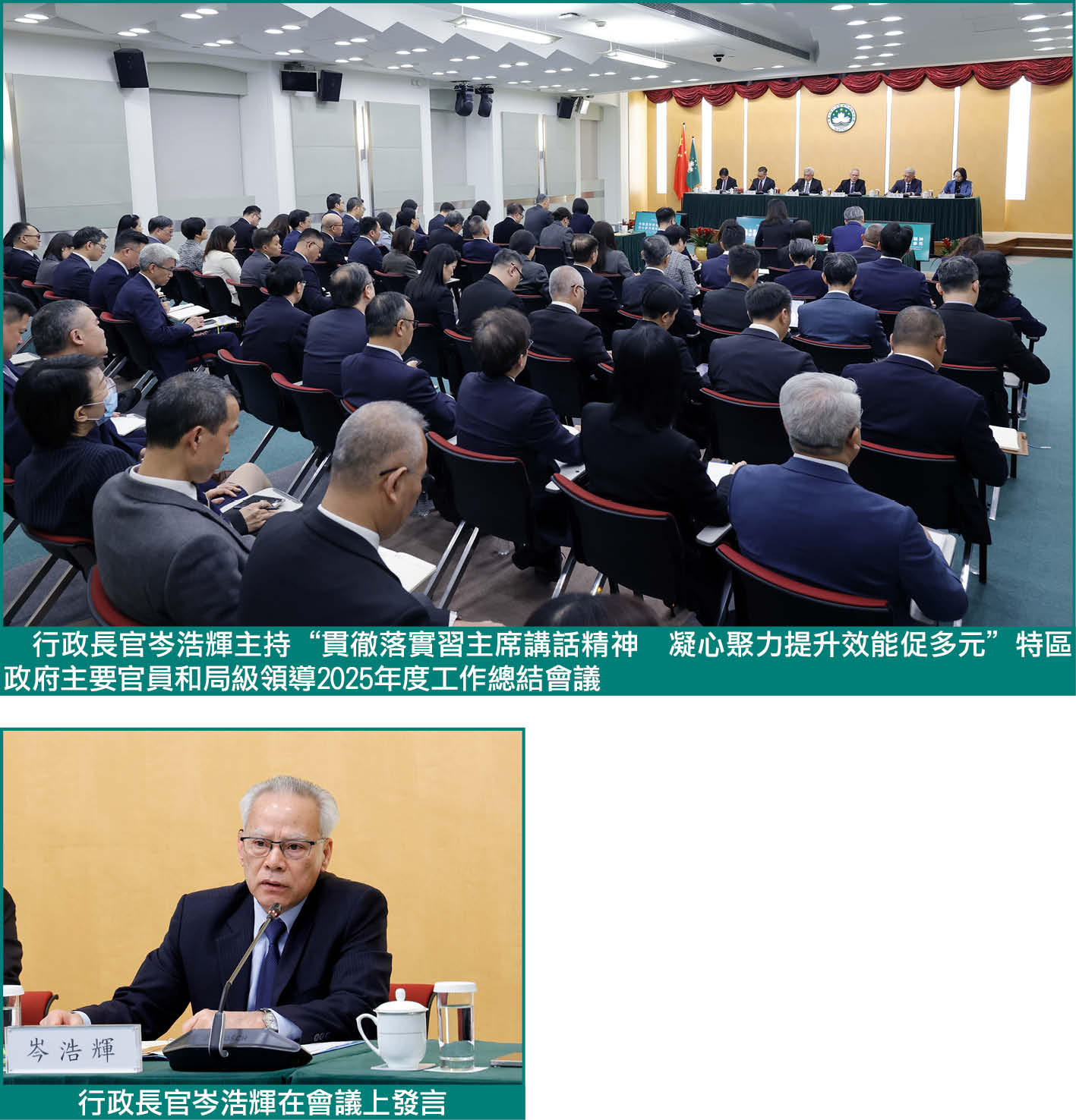 【本報訊】行政長官岑浩輝於16日下午在政府總部主持“貫徹落實習主席講話精神 凝心聚力提升效能促多元”特區政府主要官員和局級領導2025年度工作總結會議,傳達習近平主席對特區政府過去一年工作的評價,並同與會官員總結施政工作成果,查找不足,推動改進,貫徹落實習主席的重要指示及要求,更好部署2026年的施政工作。