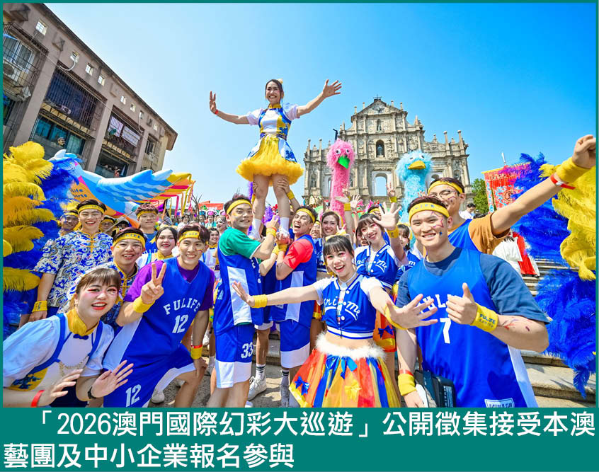 【本報訊】由文化局主辦的“2026澳門國際幻彩大巡遊”(下稱“大巡遊”),將於3月29日(周日)舉行,現公開招募已於政府登記註冊的本地社團、學校及中小企業參與大巡遊慶典活動,報名期1月25日下午5時30分截止。
