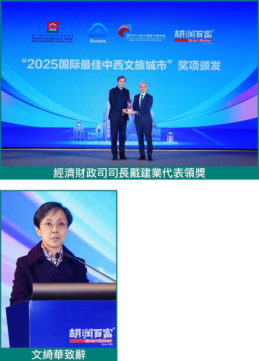 隨後舉行了“國際最佳中西文旅城市”獎項頒發儀式,由胡潤集團董事長兼首席調研官胡潤親自頒獎、戴建業代表領獎。這一榮譽充分彰顯了澳門在文旅綜合實力、國際影響力及城市魅力方面的卓越表現。主辦方亦聯合發佈《2025胡潤中國流量新勢力百強榜》(Hurun China Live StreamingInfluencers 2025)、《2025胡潤達人社會影響力百強》、《2025胡潤達人商業價值百強》。