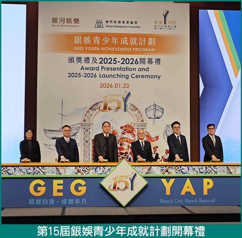 【本報訊】銀河娛樂集團(下稱“銀娛”)攜手澳門管理專業協會(下稱“管協”)合辦的“銀娛青少年成就計劃”(下稱“成就計劃”),1月22日晚假銀河國際會議中心舉行第14屆頒獎禮暨第15屆開幕禮,向第14屆優秀學員頒發獎項並播放集錦回顧視頻,以及特邀金牌運動員郭建恆分享心路歷程,同時為主題“文化傳承・職將啟航”的第15屆成就計劃揭開序幕。