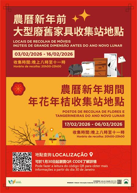 不少市民習慣於農曆新年前進行大掃除及更換大型家具,預計垃圾量會相應增加。為此,市政署將於2月3日至16日期間(農曆年十六至年廿九)在全澳各區設置136個大型廢舊家具收集站。其中,澳門半島設109個、氹仔設16個、路環設11個。市民可於所述期間晚上8時至11時,將需棄置的廢舊家具妥善擺放於指定的大型廢舊家具收集站。