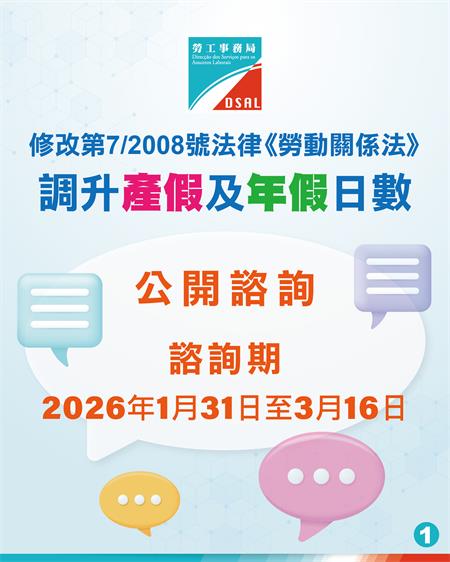 公開諮詢期為2026年1月31日至3月16日,為期45天。特區政府已將諮詢文本、圖文包、宣傳片等資訊上載於專題網頁(https://www3.dsal.gov.mo/survey/labourlaw/),歡迎公眾透過專題網頁、電郵、電話、傳真及郵寄,以及報名出席公眾諮詢會踴躍發表意見。