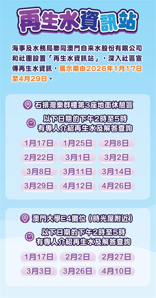 二月期間,海事及水務局及澳門自來水股份有限公司將繼續於指定日期的下午2時至5時,派出專員駐場解答居民查詢,並聽取居民意見。其中,設於澳門大學E4劉少榮樓的“再生水資訊站”專員駐場日期為22日及27日;設於石排灣樂群樓第3座休憩區的“再生水資訊站”專員駐場日期則為28日及22日。現場設有互動遊戲及資訊展板,歡迎居民到場參觀了解再生水資訊。詳情可瀏覽海事及水務局網站www.marine.gov.mo