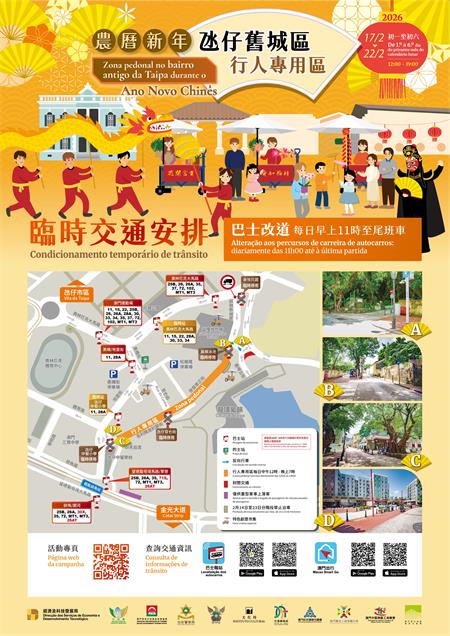 有關配合行人專用區及新春期間各臨時交通安排的詳情,可留意交通事務局稍後發佈的相關資料。市民及旅客亦可提前透過“澳門出行”、“巴士報站”App、官方微信及網頁等瀏覽即時交通資訊,及早規劃出行路線,順利出行。