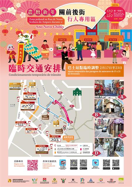 巴士服務方面,2月17日至22日每日早上11時至尾班車,氹仔舊城區四個巴士站需臨時停用,多條巴士路線需改道行駛,乘客可選用臨時站或周邊站點上落;而毗鄰關前後街區域的巴士路線維持正常運作,而因應節日期間新馬路的臨時巴士措施,2月17日至23日期間,途經草堆街的巴士路線全日實施臨時靠站安排。交通事務局已指示兩巴於客流高峰站點加強指示及增派人員協助分流乘客,並密切監測各站點候車情況,適時採取調度措施,確保公交有序服務。