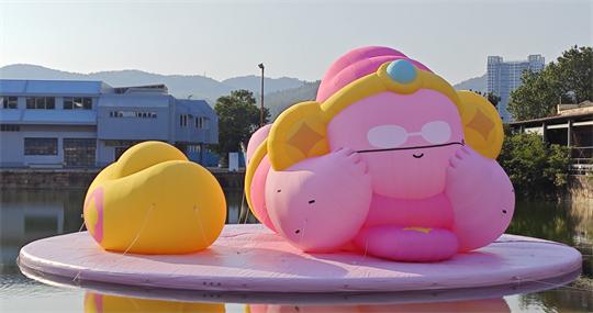 除了豐富的購物和手作體驗,市民及旅客亦可於區內打卡多組亮眼的節慶藝術裝置。本地創意品牌SEMSORRISO以原創IP“UNDERDOG”打造玻璃纖維藝術作品“金寶賀歲”,角色化身粉色財神並搭配“水上浮舟”元寶,呈現慢節奏迎福美學。“永利紙料實驗室”則以品牌IP“福祿壽”打造玻璃纖維藝術作品“迎財接福”,以元寶幾何與神香蠟燭為靈感,將傳統祭祀意象轉化為療癒日常,展現當代文化創意。由意大利藝術家Bertil Butturini與中國插畫師Jingo Li攜手創作的“BERTILO粉小胖”今年再度回歸媽閣塘,作品“躺福”以輕鬆可愛的粉色財神形象現身,與圓潤元寶一同悠然飄浮於水面之上。透過本地文化創意與外地藝術視野的交融與碰撞,共同為片區增添獨特的文化風景。