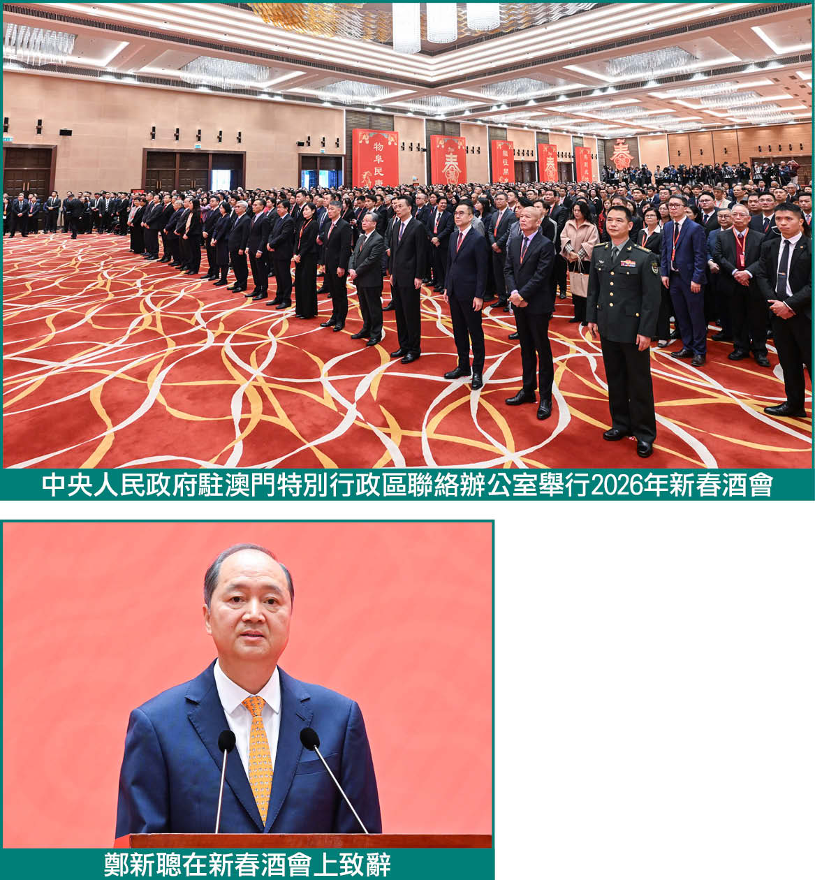 【本報訊】2月5日下午,中央政府駐澳門聯絡辦公室舉辦2026年新春酒會。受中央港澳辦主任、國務院港澳辦主任夏寶龍委托,中央港澳辦副主任、國務院港澳辦副主任,中央政府駐澳門聯絡辦公室主任鄭新聰代表夏寶龍主任、中央港澳辦、國務院港澳辦和中央政府駐澳門聯絡辦公室向廣大澳門居民致以新春祝福。澳門特別行政區行政長官岑浩輝出席並致辭,全國政協副主席何厚鏵,前行政長官賀一誠,外交部駐澳門特派員公署特派員卞立新,解放軍駐澳門部隊司令員于長江、政委林慶華,中央政府駐澳門聯絡辦公室副主任黃柳權、呂玉印、張應杰,以及特別行政區立法、司法機構主要負責人,特別行政區政府主要官員,澳區全國人大代表、全國政協委員,特別行政區行政會委員、立法會議員,以及澳門社會各界代表人士約1300人出席酒會。
