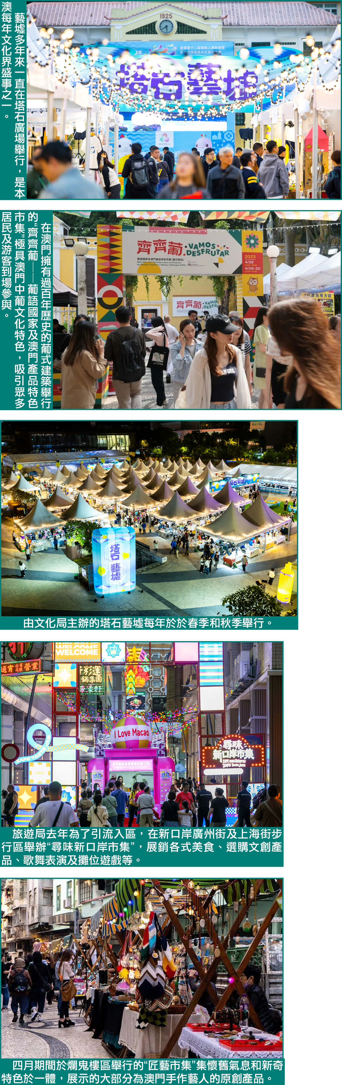 此外,每逢節慶,本澳亦有不同主題、規模不一的市集遍佈各區,短暫凝聚人氣,激活消費,亦是展示澳門中西文化交融的窗口。近年政府及社團積極提振社區經濟、推動片區活化,各區舉辦市集,模式逐步向“文化+旅遊+消費”轉型。