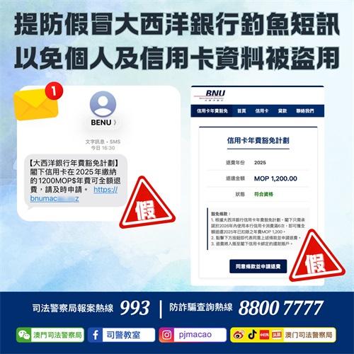 【本報訊】司法警察局今日發現有騙徒假冒澳門大西洋銀行的名義,隨機向市民濫發釣魚短訊。內容訛稱豁免用戶信用卡年費,誘導市民點擊短訊內附帶的釣魚連結以申請退還款項MOP1200。若市民點擊該連結,將會進入一個假冒“大西洋銀行”的釣魚網站。該網站會要求市民填寫姓名、手機號碼,並要求輸入信用卡號碼、有效期限及安全碼等資料進行驗證。一旦騙徒成功盜取相關資料後,便會利用這些資料進行未經授權的大額交易。