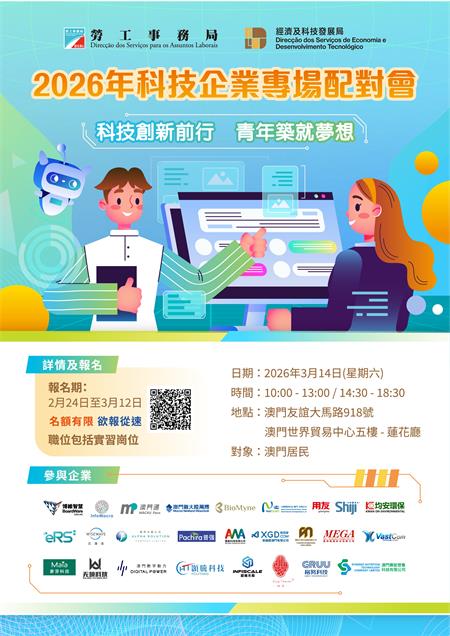 【本報訊】為積極配合特區政府推動經濟適度多元發展策略,協助科技企業招聘人才並促進本澳青年就業,勞工事務局(下稱“勞工局”)與經濟及科技發展局(下稱“經科局”)將於3月14日合辦“2026年科技企業專場配對會”,為有意投身科技行業的本澳居民提供即場面試及就業對接機會,推動青年投身科創產業,培養本地多元化人才。