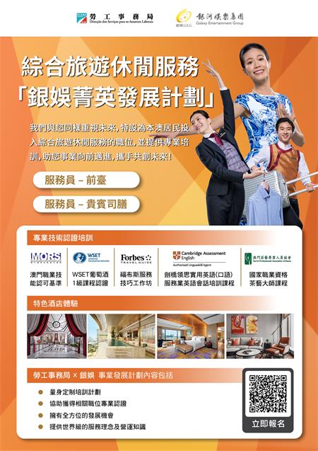 【本報訊】為向本地居民提供更多元的職涯選擇與向上流動機會,勞工事務局(下稱“勞工局”)與銀河娛樂集團(下稱“銀娛”)合作推出“銀娛菁英發展計劃(酒店營運)”(下稱“計劃”),以“先入職、後培訓”模式為本澳居民提供就業及培訓機會,計劃將於2月27日起接受申請。