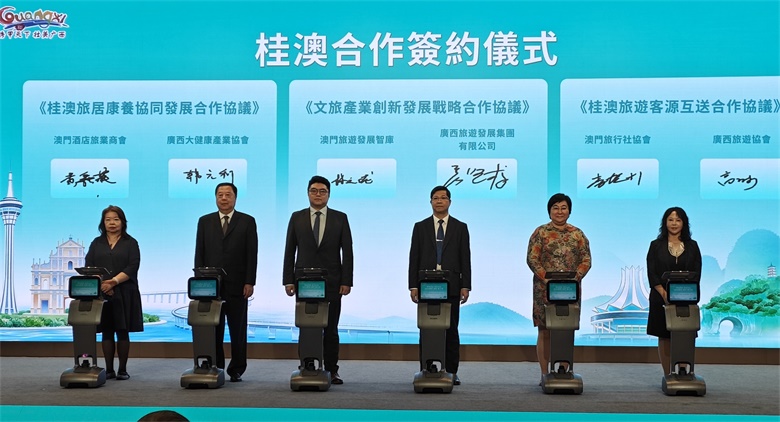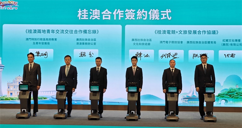 及後,澳桂兩地代表在現場嘉賓的見證下,簽署了《廣西壯族自治區港澳事務辦公室與澳門特別行政區政府教育及青年發展局桂澳兩地青年交流交往合作備忘錄》《桂澳電競+文旅發展合作協議》《桂澳旅遊客源互送合作協議》《廣西旅遊發展集團與澳門旅遊智庫 文旅產業創新發展戰略合作協議》《桂澳旅居康養協同發展合作協議》,涉及青年交流、電競文旅、客源互送、產業創新、旅居康養等領域。