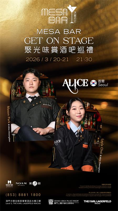 【本報訊】繼去年廣受好評後,澳娛綜合度假股份有限公司(“澳娛綜合”)將於320日至21日在澳門上葡京綜合度假村(“上葡京”)繼續呈獻“聚光味賞酒吧巡禮”系列活動。來自首爾人氣酒吧Alice Cheongdam的總經理Mason Park與調酒師Layla Choi將重磅登陸味賞酒吧,為賓客帶來一趟充滿想像力與韓國當代調酒活力的創意品酒之旅。