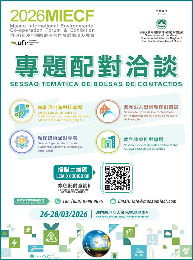 由澳門特別行政區政府主辦的2026MIECF將於26日至28日假澳門威尼斯人金光會展舉行,為綠色創新科技及項目提供展示及合作平台。詳情請瀏覽大會網站或致電(853)8798 9675向主辦單位查詢;亦歡迎關注微信官方帳號“MIECF”以獲取最新大會資訊。
