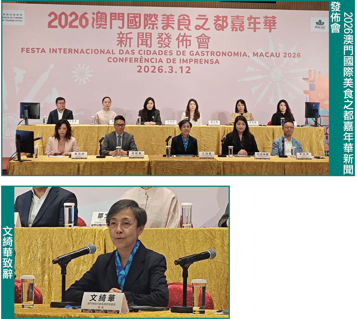 新聞發佈會12日上午假漁人碼頭會展中心舉行,旅遊局局長文綺華、副局長程衛東及司徒琳麗、澳門旅遊大學廚藝管理課程主任黃燕妮、各合作夥伴及場地支持單位等代表出席。