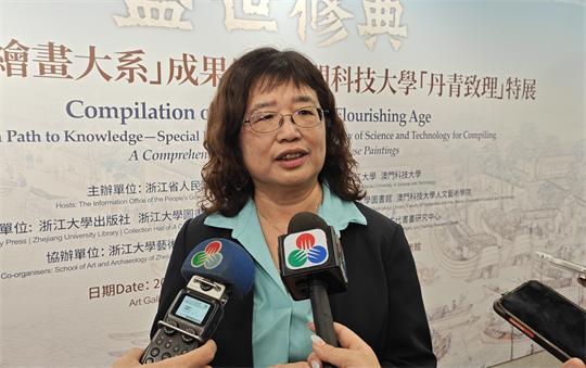 肖瓏分享稱,“大系”是中國古代繪畫的集大成;是中國歷史文化藝術的全景;是研究中國古代藝術、經濟及科學的學術瑰寶。她在現場接受採訪時稱,“大系”因簽有協議不會在網上有清晰的電子版,澳科大館藏的“大系”不僅是本校師生,亦歡迎廣大市民和友校師生來觀賞,一同提升人文素養;並稱在是次交流活動中,亦有來自澳門大學等其他學校的圖書館館長過來交流。