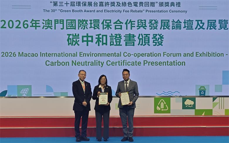 此外,現場還頒發了2026MIECF展會、展台及鏡平學校2024年度小幼部碳中和證書,同時為2025年成功申請綠色/碳中和認證的單位,頒發“2025年澳門綠色會展及活動踐行單位”獎項,進一步激發全行業踐行綠色會展的積極性,助力澳門會展業綠色高質量發展。
