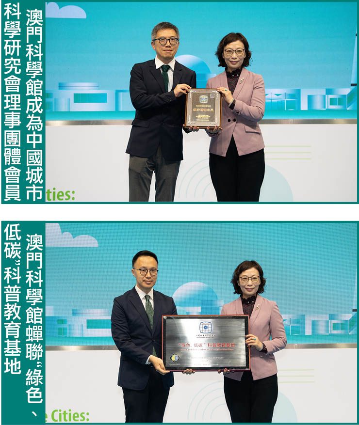 “綠色、低碳”科普教育基地頒授儀式於27日在“2026年澳門國際環保合作發展論壇及展覽”上舉行。在招商投資促進局行政管理委員會代主席黃伊琳、環境保護局環境規劃評估廳廳長陳美寳等代表見證下,中國綠色建築與節能(澳門)協會會長卓重賢向澳門科學館頒授由中國城市科學研究會認證的牌匾。是次蟬聯“綠色、低碳”科普教育基地殊榮,標誌着該館在綠色低碳科普教育的工作獲得持續肯定。隨後,中國綠色建築與節能(澳門)協會理事長李加行亦向澳門科學館頒授“中國城市科學研究會理事團體會員”牌匾。兩項榮譽均由澳門科學館股份有限公司董事長穆欣欣代表接受。