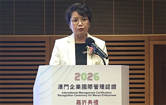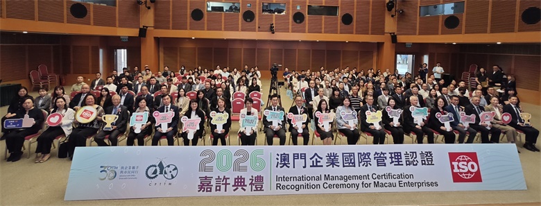 【本報訊】澳門生產力暨科技轉移中心(下稱“生產力中心”)於42日假澳門科學館舉行“2026澳門企業國際管理認證嘉許典禮”,表彰共134家持續持有國際認證的本澳企業。典禮依企業連續持證年資頒發金獎、銀獎及銅獎,並特別增設“綜合管理成就獎”,以嘉許模範企業。